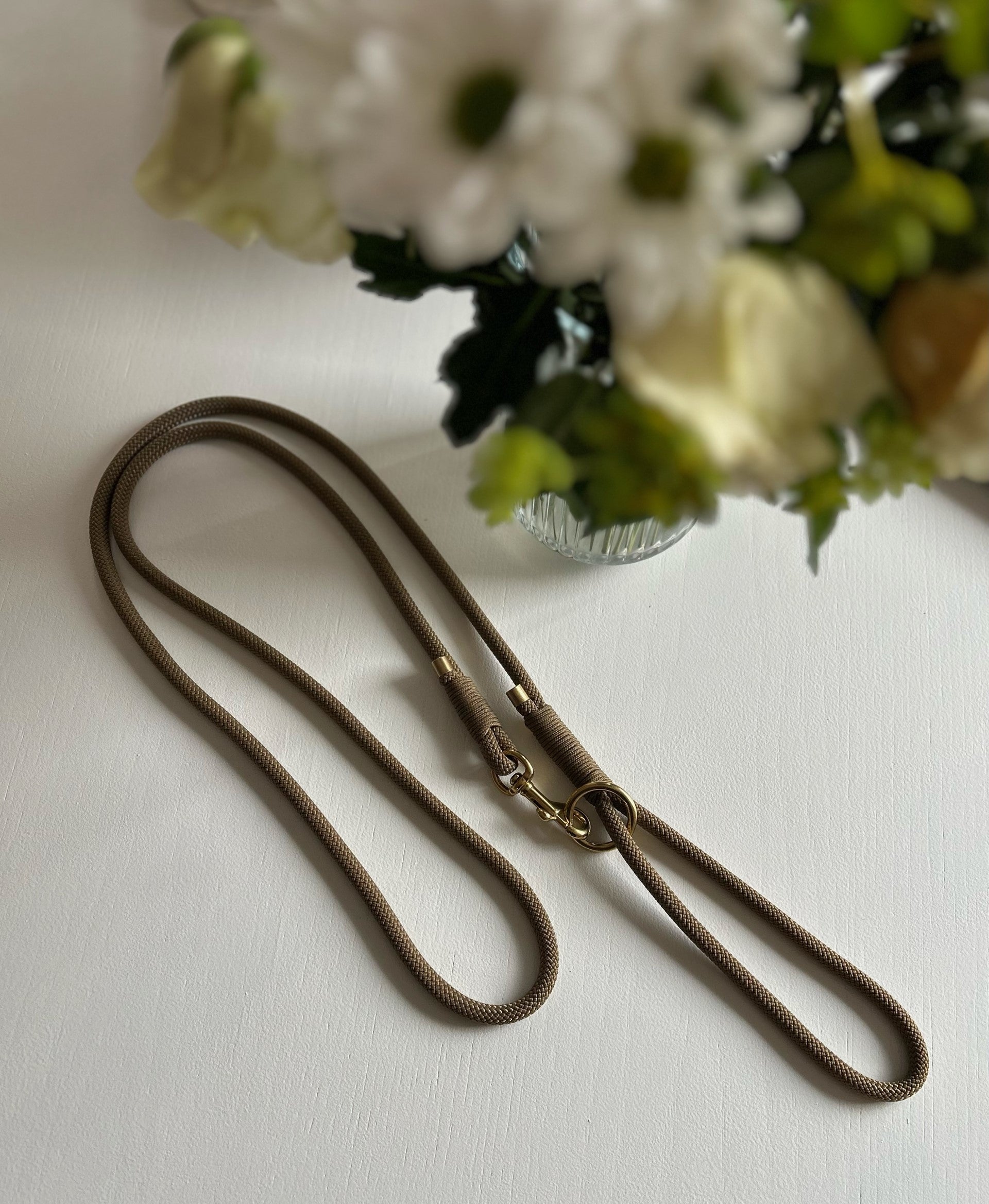 O-ring og karabin er i støbt messing, hvilket gør metallet både solidt og giver snoren et elegant udtryk. O-ringen er samtidigt brugbar til eksempelvis at binde en hundepose fast i på jeres ture. Vi har et bredt udvalg af farver, så du kan finde lige præcis dén der passer til dig og din hunds stil.